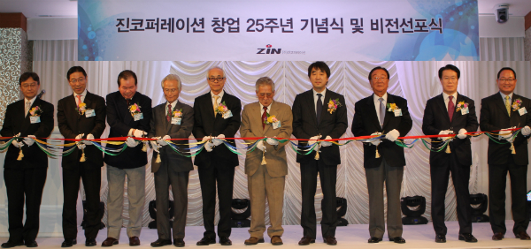 ▲진코퍼레이션 창립 25주년 비전 선포식에서 이창희 대표와 주요 협력업체, 고객사 관계자들이 테이프를 절단하고 있다.